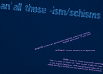 ism: from the Greek noun suffix meaning ‘the act, state, or theory of.’ ‘ism’ is also Arabic for noun. In the English Language, -ism has gradually taken on an added feeling of disapproval and association with problems " : Navy Blue